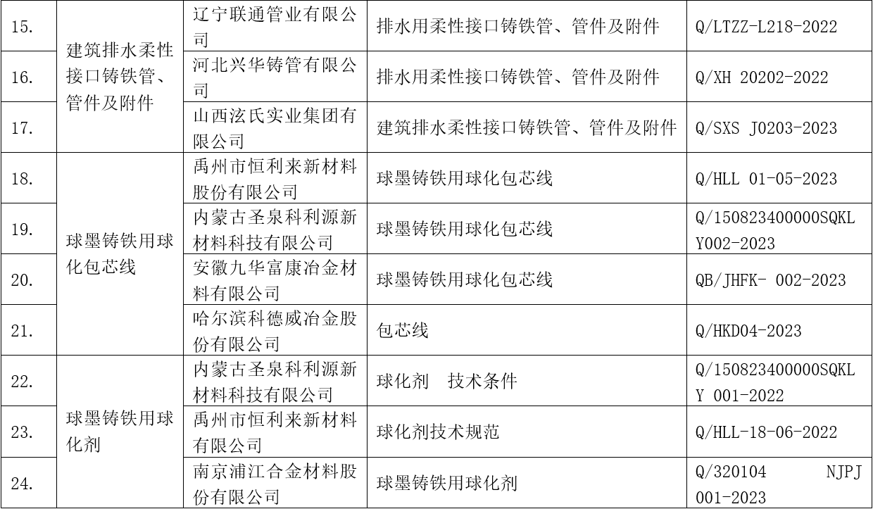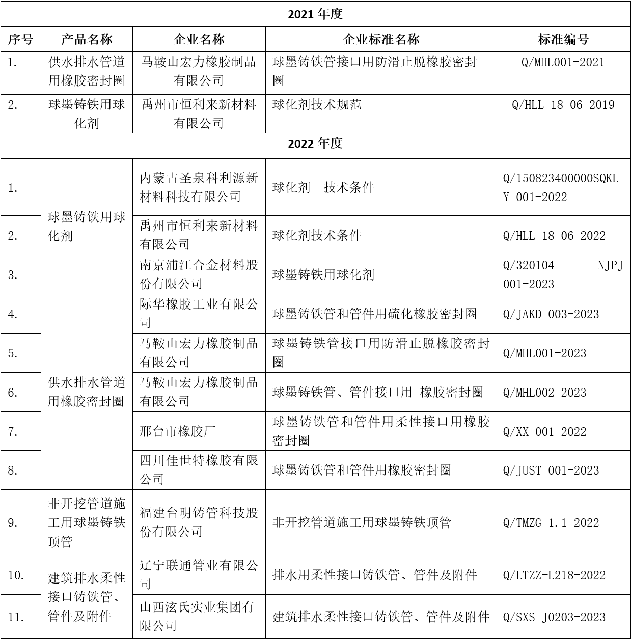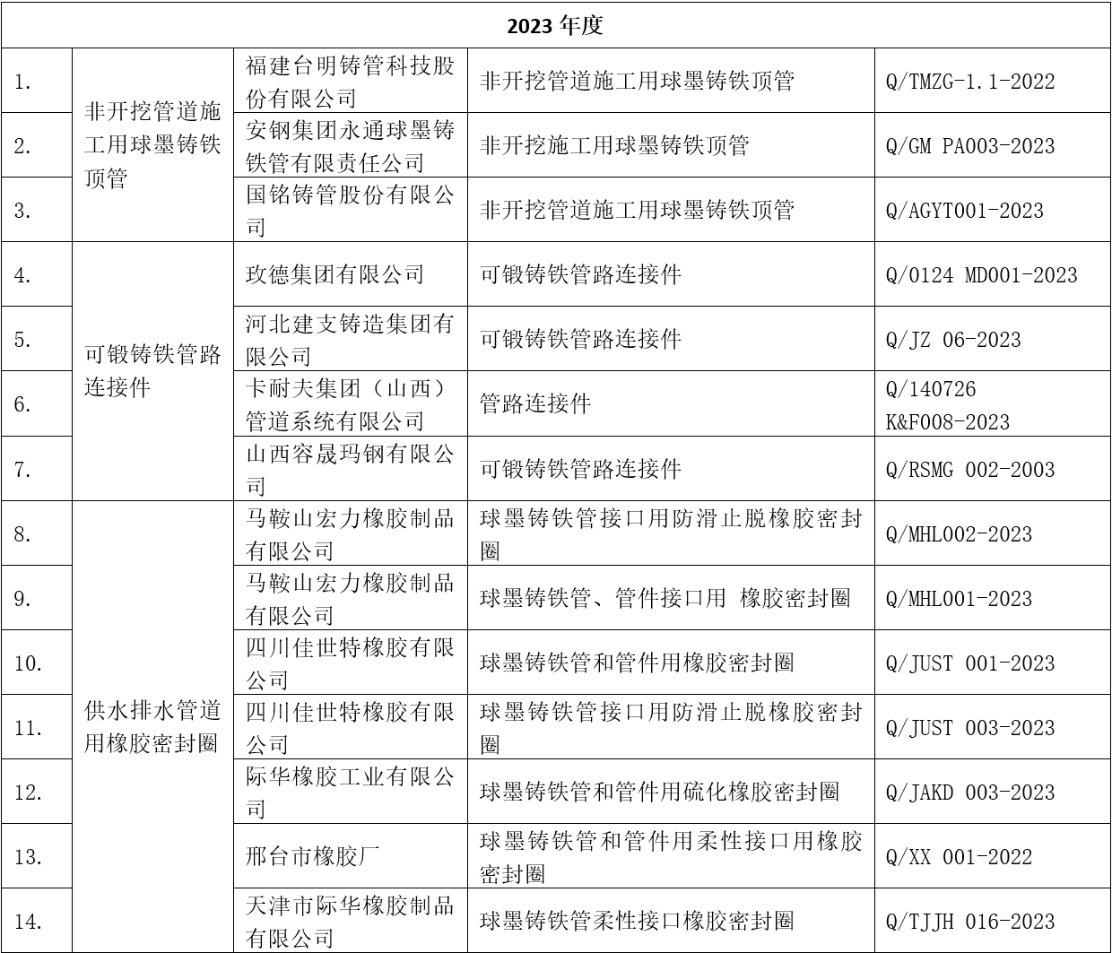 At the meeting, Fujian Taiming Cast Iron Pipe Technology Co., Ltd., Angang Group Yongtong Ductile Iron Pipe Co., Ltd., Guoming Cast Iron Pipe Co., Ltd., Meide Group Co., Ltd., Hebei Jianzhi Casting Group Co., Ltd., Carnegie Group (Shanxi) Pipeline System Co., Ltd., Shanxi Rongshengma Steel Co., Ltd., Yuzhou Hengcheng Iron Pipe Co., Ltd. were selected as the "leaders" of enterprise standards in six product areas, including ductile iron top pipes for non excavation pipeline construction, malleable iron pipe connectors for water supply and drainage pipelines, rubber seals for water supply and drainage pipelines, flexible interface cast iron pipes, fittings and accessories for building drainage, ductile iron core wires for ductile iron, and spheroidizing agents for ductile iron. Lili New Materials Co., Ltd., Inner Mongolia Shengquan Ke Liyuan New Materials Technology Co., Ltd Anhui Jiuhua Fukang Metallurgical Materials Co., Ltd., Harbin Kedewei Metallurgical Co., Ltd., Liaoning Unicom Pipe Industry Co., Ltd., Hebei Xinghua Cast Pipe Co., Ltd., Shanxi Luoshi Industrial Group Co., Ltd., Nanjing Pujiang Alloy Materials Co., Ltd., Ma'anshan Hongli Rubber Products Co., Ltd., Sichuan Jiashite Rubber Co., Ltd., Jihua Rubber Industry Co., Ltd., Xingtai Rubber Factory, and Tianjin Jihua Rubber Products Co., Ltd. have issued certificates.